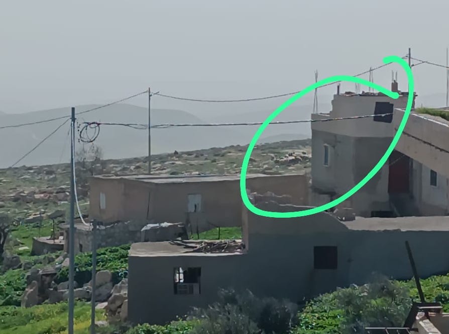 The above photo shows sheep belonging to a settler (circled in green) next to a Kisan residence. The video below shows the settler bringing his flock hard by the house; you can hear the voices of two Palestinian children. Imagine the impact of this on children. Imagine their lives.