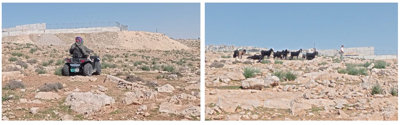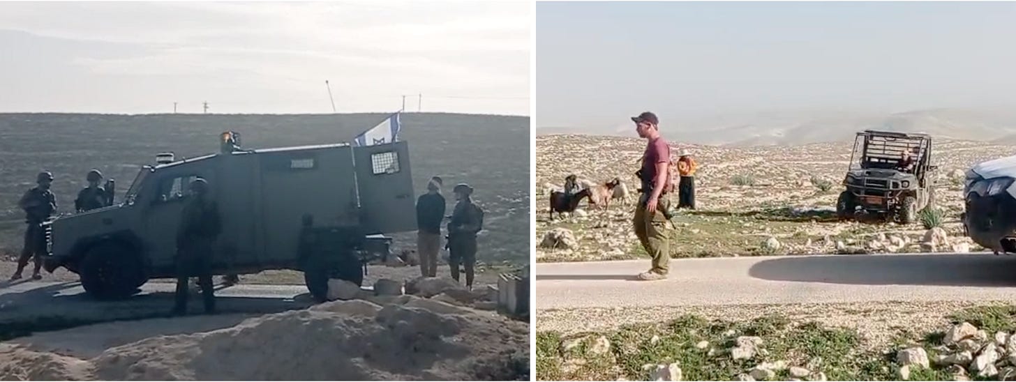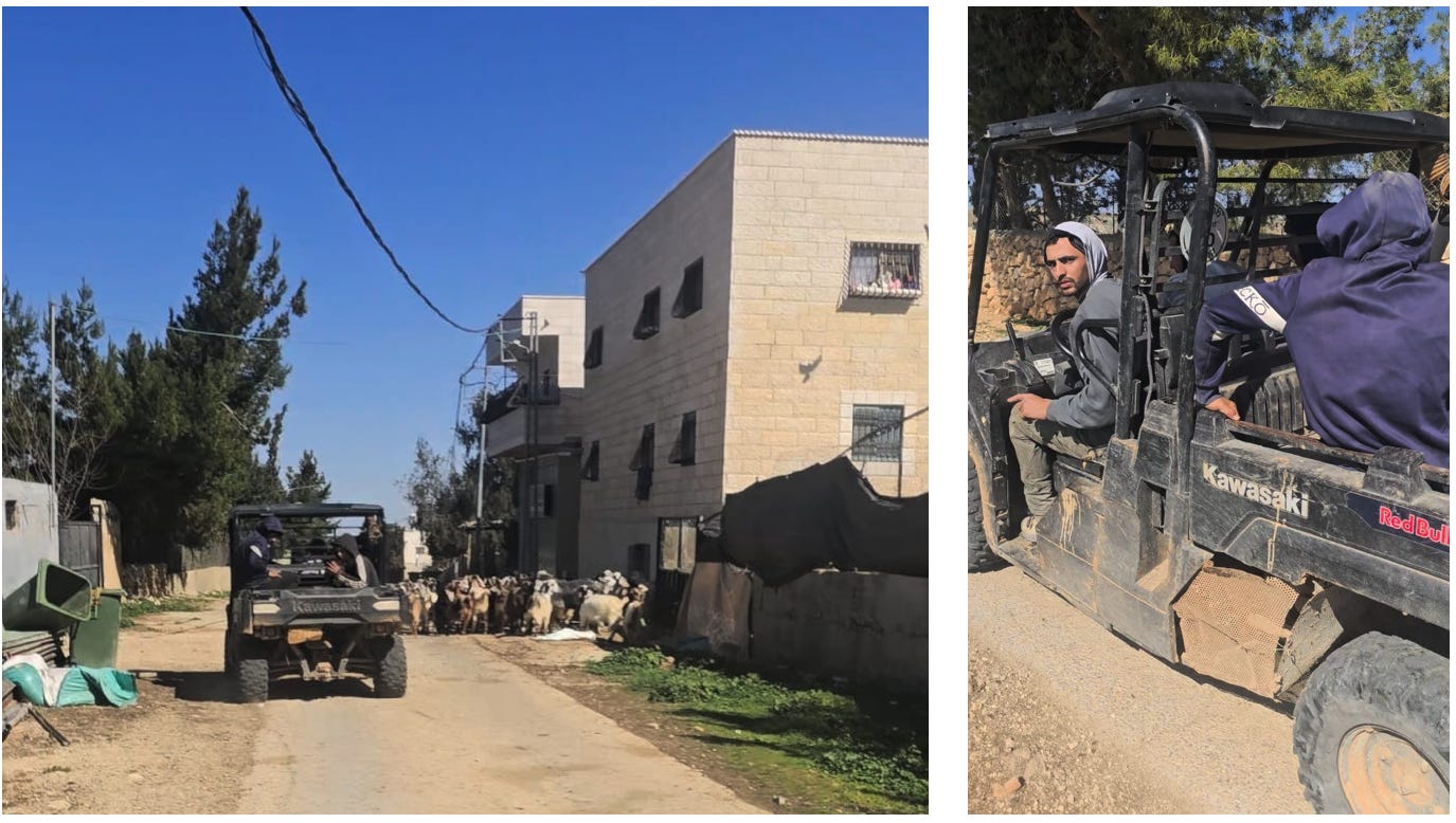 The following screenshots were taken from videos of settlers on all-terrain vehicles and with their herds. They have hundreds of dunams of stolen land but drive their sheep and vehicles as close to the village as possible.
