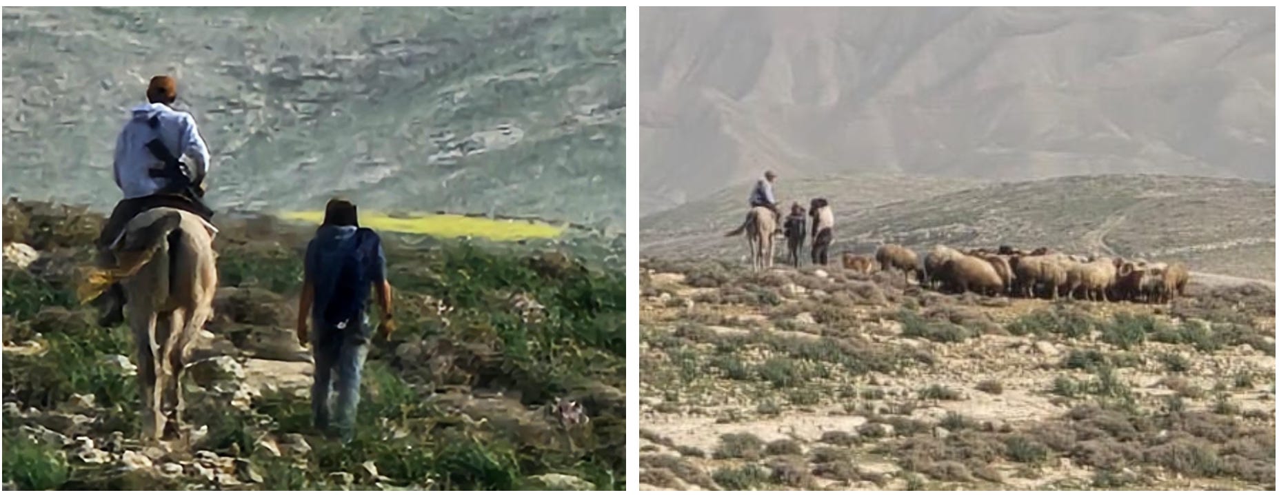 The photo above on the left shows an armed settler on horseback; to the right are Jewish herders accompanied by their armed and mounted guard.
