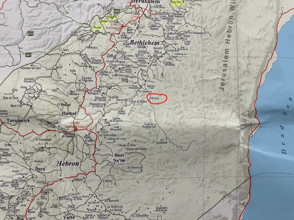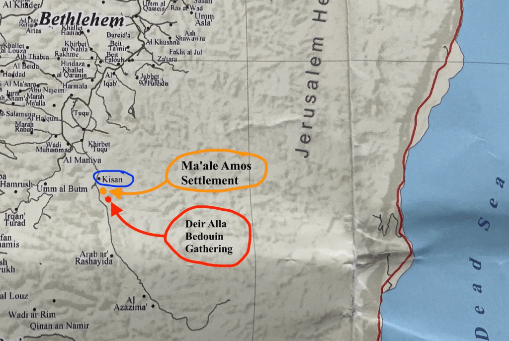 The map bellow locates Kisan, circled in red, relative to Bethlehem and Hebron. The second map identifies the location of the illegal Ma’ale Amos settlement and Deir Alla relative to Kisan.