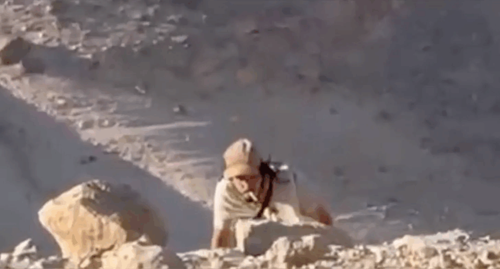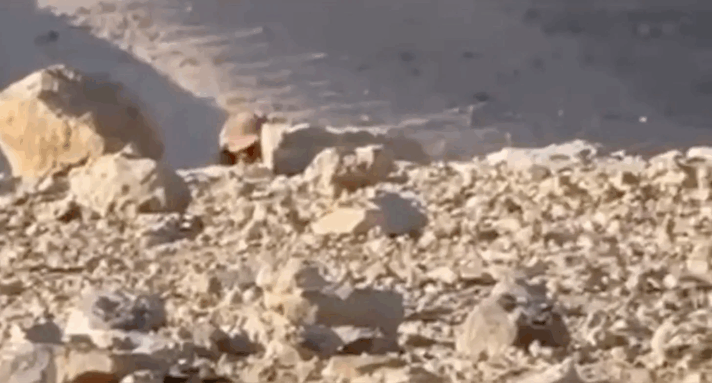 The following two photos, screenshots taken toward the end of the video above, show the same herder ducking and hiding behind a rock. This Jewish settler is using his herd to trespass on Palestinian land. He makes his presence known as he spies on the family he’s targeting.